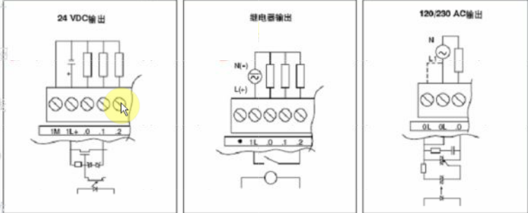 数字量输出模块有4点、8点输出,4点输出分为晶体管输出和继电器输出,8点输出分为晶体管输出、继电器输出和交流输出,晶体管输出只能接成源型24V直流输出,电流从输出点流出,继电器输出是一组共用了一个公共端的干接点,可以接交流或直流,电压等级最高到220V,但要保证一组输出接同样的电压,继电器输出点接直流输出时功能端接正或负都可以,EM222的接线方式可作为CPU集成输出点的参考。