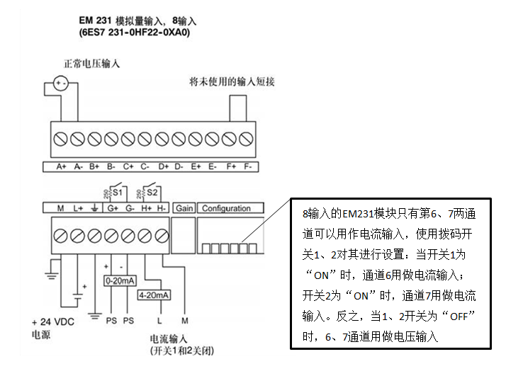 8输入EM231模块接线方法与4输入EM231模块类似,但只有最后两个通道,即第6、7两通道,可以用作电流输入,使用拨码开关1、2对其进行设置,当开关1为"ON"时,通道6用做电流输入;开关2为"ON"时,通道7用做电流输入。反之,当1、2开关为"OFF"时,6、7通道用做电压输入。