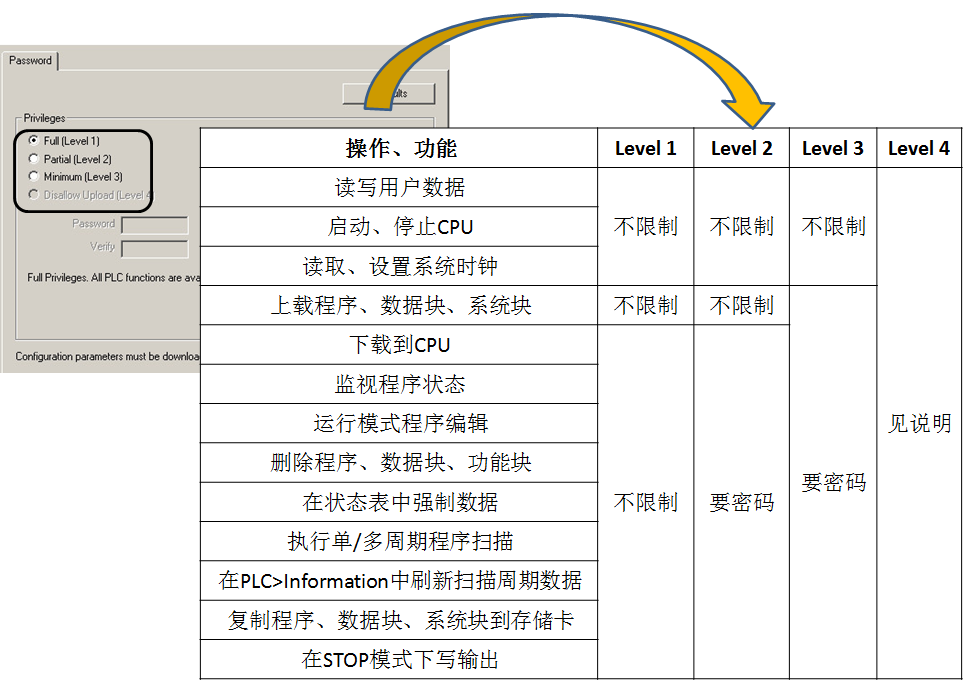 S7-200CPU一共有4级访问权限,一级权限对CPU的读写数据、上传下载、强制数据、删除程序等操作都是不做限制的;如果设置的是二级密码,那么对读写数据、启动CPU、上载程序是不做限制的,但是从"下载到CPU"以下的操作是要密码的;如果设置的是三级密码,那么对读写用户数据等操作是不做限制的,对"上载程序"以下的操作是需要密码的;如果是四级密码,则是最高等级,不允许上载,即使是指导正确的密码也不能上载,该选项也不准许执行状态监控、运行模式编辑和项目比较。其他功能和三级密码相同。