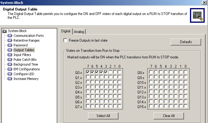 I/O输出表可以选择将输出冻结在最后的状态,也可以通过选择使被选中的点在CPU从运行到停止的时候保持在接通的状态,没有被选中的输出点的状态将不会被保持。