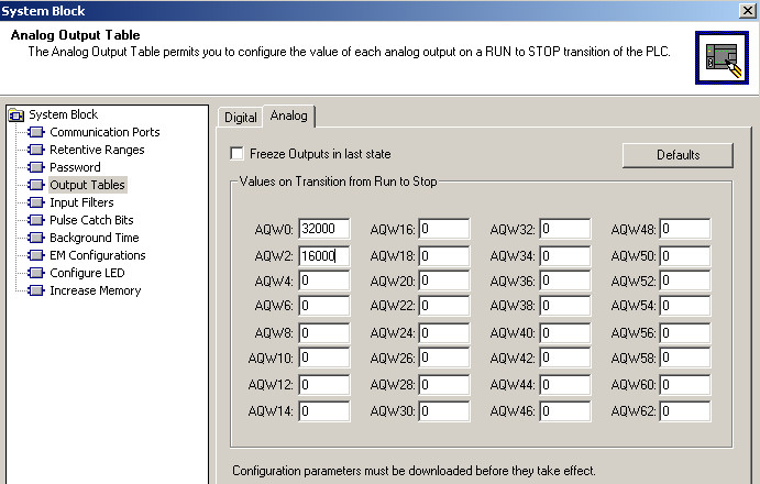 模拟量的输出也是一样的道理,可以将输出冻结在最后的状态,也可以将CPU从运行到停止时的值做一些设置,设置以后模拟量输出点的的值在CPU停机的时候会保持在设置的输出状态。