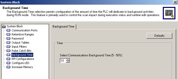 背景时间可以设置PLC的一些背景活动,如控制程序执行状态的监控或者运行模式编辑所占的CPU扫描周期的百分比,通常可以在5%~50%之间调节,默认值是10%,这是一个比较合适的值,我们也可以去做一些更改。