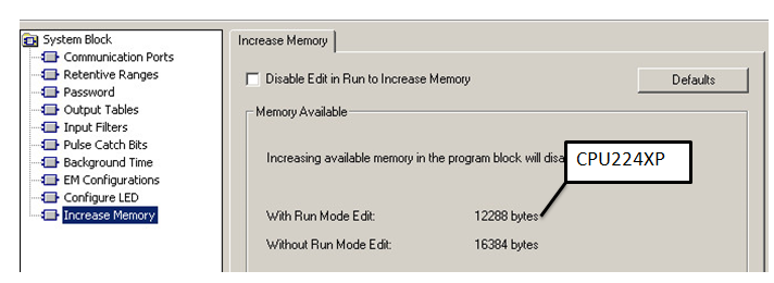 23版CPU的新功能(运行时编程)需要占用一部分程序存储空间。如果要利用全部的程序存储区,对于特定的一些CPU型号,需要禁止"运行模式编程"功能。具体的做法就是将"禁止'运行模式编程'以增加存储区"勾掉,对于CPU224XP,在不勾的时候程序存储区是12288个字节,勾上以后字节数会增加16384,存储空间得到了一些提升。