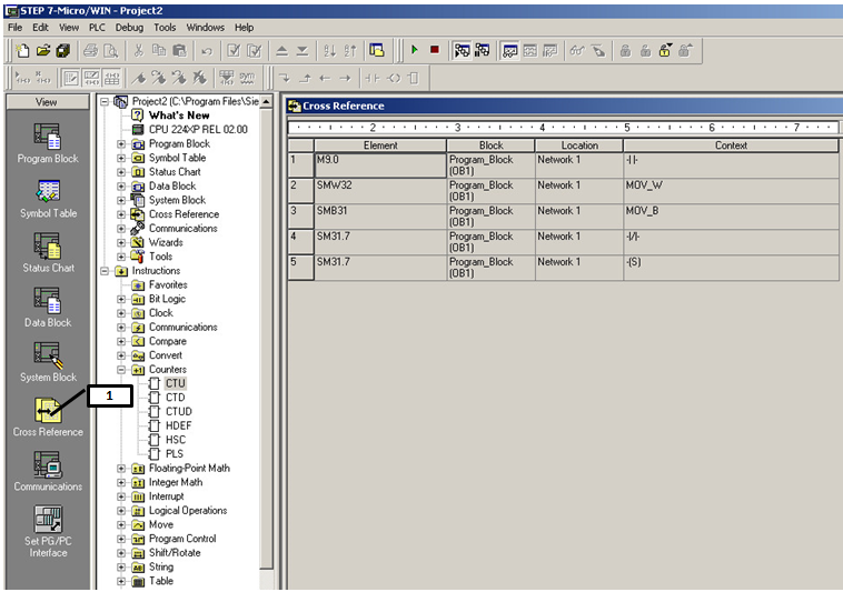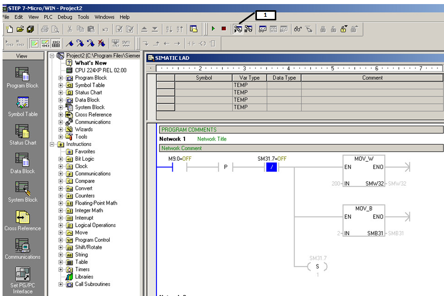 将程序下载在PLC中并运行,点击程序监控按钮(图标1)即可对程序运行进行监控;