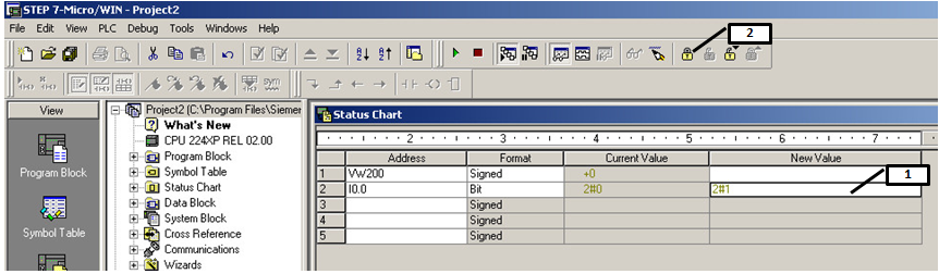 在状态表中"新值"(New Value)一栏中写入需要强制的值(图标1),点击工具栏中的强制按钮(图标2)即可对数据进行强制。