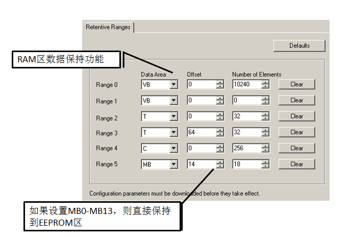 在上图系统断点数据保持的设置中,范围0的数据区定义的是VB,偏移量是0,那么数据保持就从VB0开始,单元数目10240是指从VB0开始的10240个字节的数据在断点以后是可以得到保持的,它的数据保持是通过CPU里集成的超级电容或外插电池卡来进行的。在范围5中定义M区数据保持是从MB14开始的18个字节,它们在断点以后是可以进行数据保持的,但是M区有一个特点,比如说偏移量设置是0,单元数设置为14,那么这14个字节在CPU断电的时候数据会直接保持在EEPROM区。