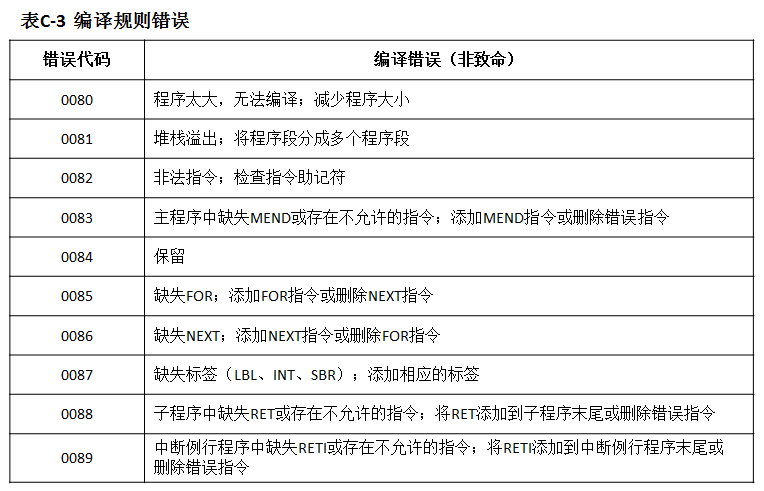 错误代码可以在手册的附录中找到,里面有编译规则错误,如程序太大,非法指令,缺失FOR等,当CPU报程序编译错误的时候可以根据错误代码去查找错误的内容以及解决的方法。