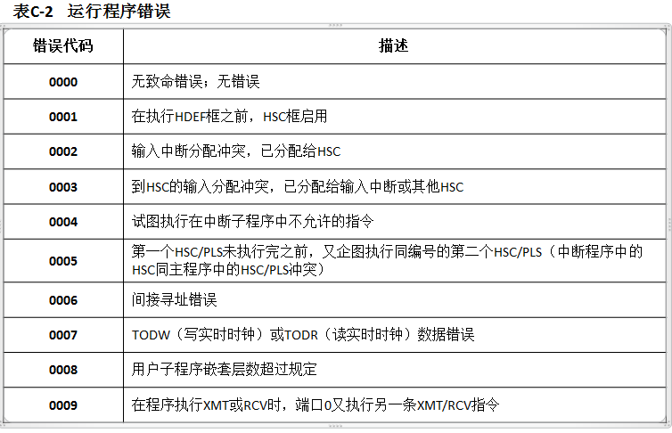 在系统手册的附录中同样可以找到对程序执行错误代码的解释,如常见的间接寻址错误、读写实时时钟的错误等。