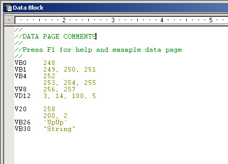 当有一些重要的数据不需要做变化而是需要长期保存时,我们可以将这些数据写入数据块中。数据块的定义方式很简单:如定义VB0,后面写上248,这样就定义了VB0的值为248;定义VB1,后面写上249、250、251,则是定义了VB1为249,VB2为250,VB3为251。同样也可以定义字、双字的存储区,也可以直接写编程的地址,CPU通过后面的数值自动判断数据类型。当数据块被下载到CPU中时,数据将会得到永久的保存。