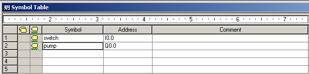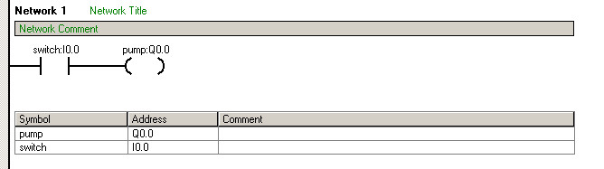 首先,定义一个符号开关"switch",地址为I0.0,定义一个符号泵"pump",地址为Q0.0。