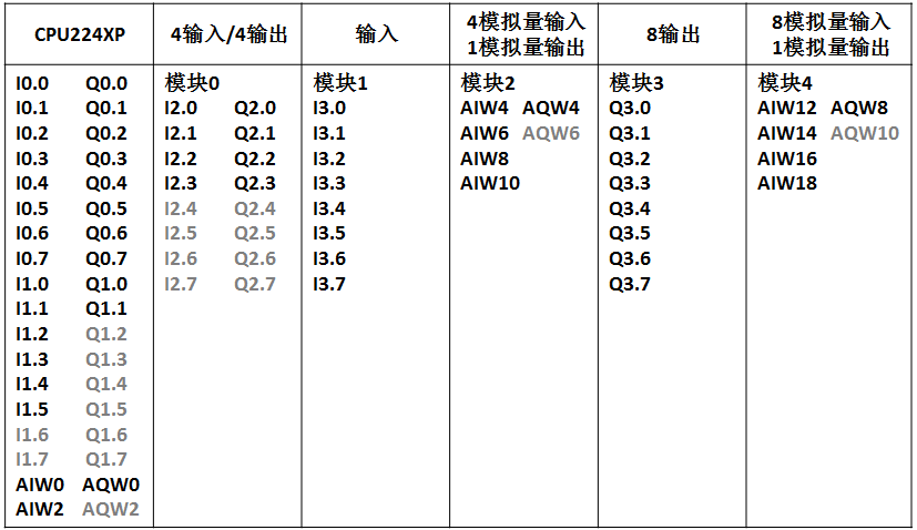 对于CPU224XP,它本体上的数字量输入点是从I0.0—I1.5,没有用到的I1.6、I1.7也占用了,在添加扩展模块时,数字量输入点只能从I2.0开始,本体上数字量输出点是从Q0.0—Q1.1,Q1.2—Q1.7被占用,扩展模块上只能从Q2.0开始,对于扩展模块也是同样的道理。在本体上模拟量是2入1出,输入是AIW0和AIW2,输出时AQW0,但是AQW2也是被占用的。对于模拟量的扩展模块而言,模拟量的输入只能从AIW4开始,模拟量的输出时从AQW4开始,模拟量的扩展模块在使用AQW4的时候也占用了AQW6,下一个模拟量的模块只能从AQW8开始。