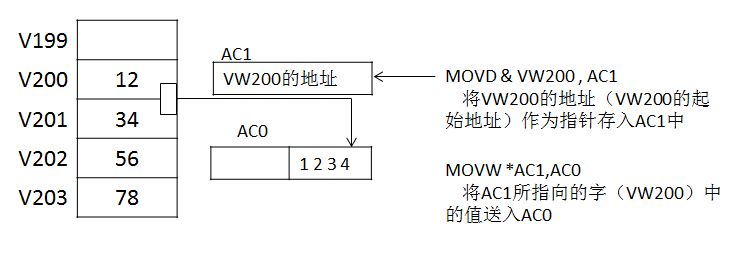 (9)间接寻址间接寻址是指用指针来访问存储区数据。指针以双字的形式存储其他存储区的地址。只能用V存储器或者累加器寄存器(AC1、AC2、AC3)作为指针。如果要使用间接寻址,应该用"&"符号加上要访问的存储区地址来建立一个指针。当指令中的操作数是指针时,应该在操作数前面加上"*"号。