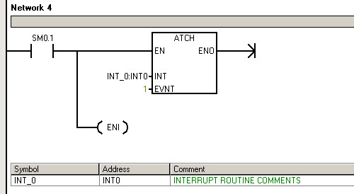 执行完子程序后会继续向下扫描,在扫描周期过程当中使用了一个中断,是I0.0下降沿中断,如果在整个扫描周期范围之内,检测到有I0.0下降沿中断事件到来的时候会去优先处理中断,中断是写在INT_0中的,中断程序是把M0.0置位,也就是说当有I0.0下降沿到来的时候M0.0被置位;