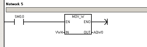 第五条语句是做一个模拟量的输出,将变量VW4里面的值传送给AQW0;