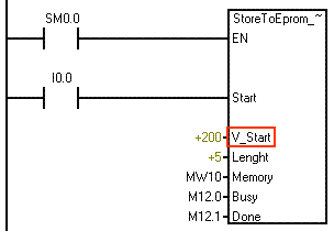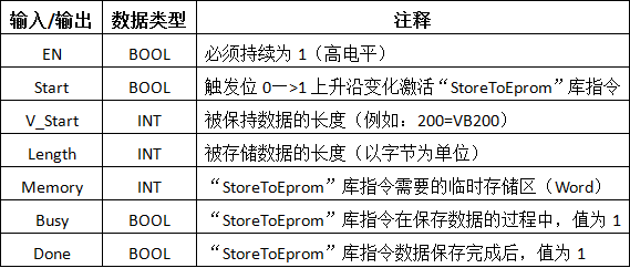EEPROM数据写入指令库用于将连续V存储区中的数据(例如VB200至VB205)写入EEPROM,使其永久保持。