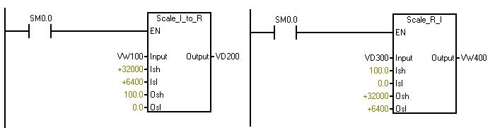 上图分别为将测量整数值转化为实际工程量程序和将实际值装化为S7-200输出整数值程序。左图中,0sh、0sl分别表示工程量的上下限值,lsh、lsl分别表示S7-200测量值的上下限,通过在Input输入测量值,在Output得到转换后的物理量数值。右图中,lsh、lsl表示工程物理量百分比的上下限,0sh、0sl表示S7-200输出整数值的上下限,通过在Input输入工程物理量的百分比从而在Output得到转换后的测量整数值。另外,也可以通过Scale_R_to_R指令将百分比转换为工程物理量的实际值。